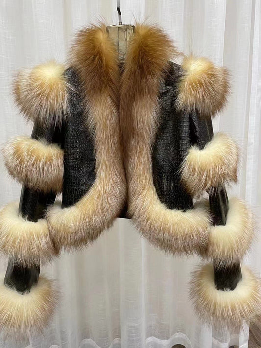 Elegant Bright Leather Fox Fur Coat